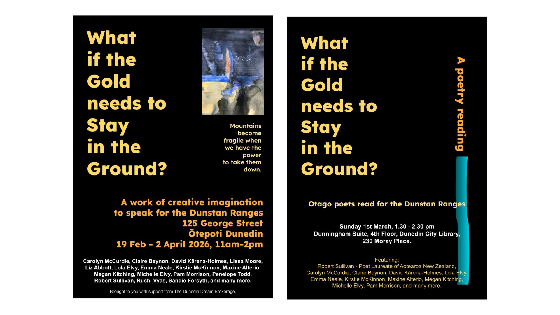 Dunedin Dream Brokerage is proud to support What if the Gold Needs to Stay in the Ground?, a 42-day art and poetry installation by Ōtepoti artist and writer Kirstie McKinnon.